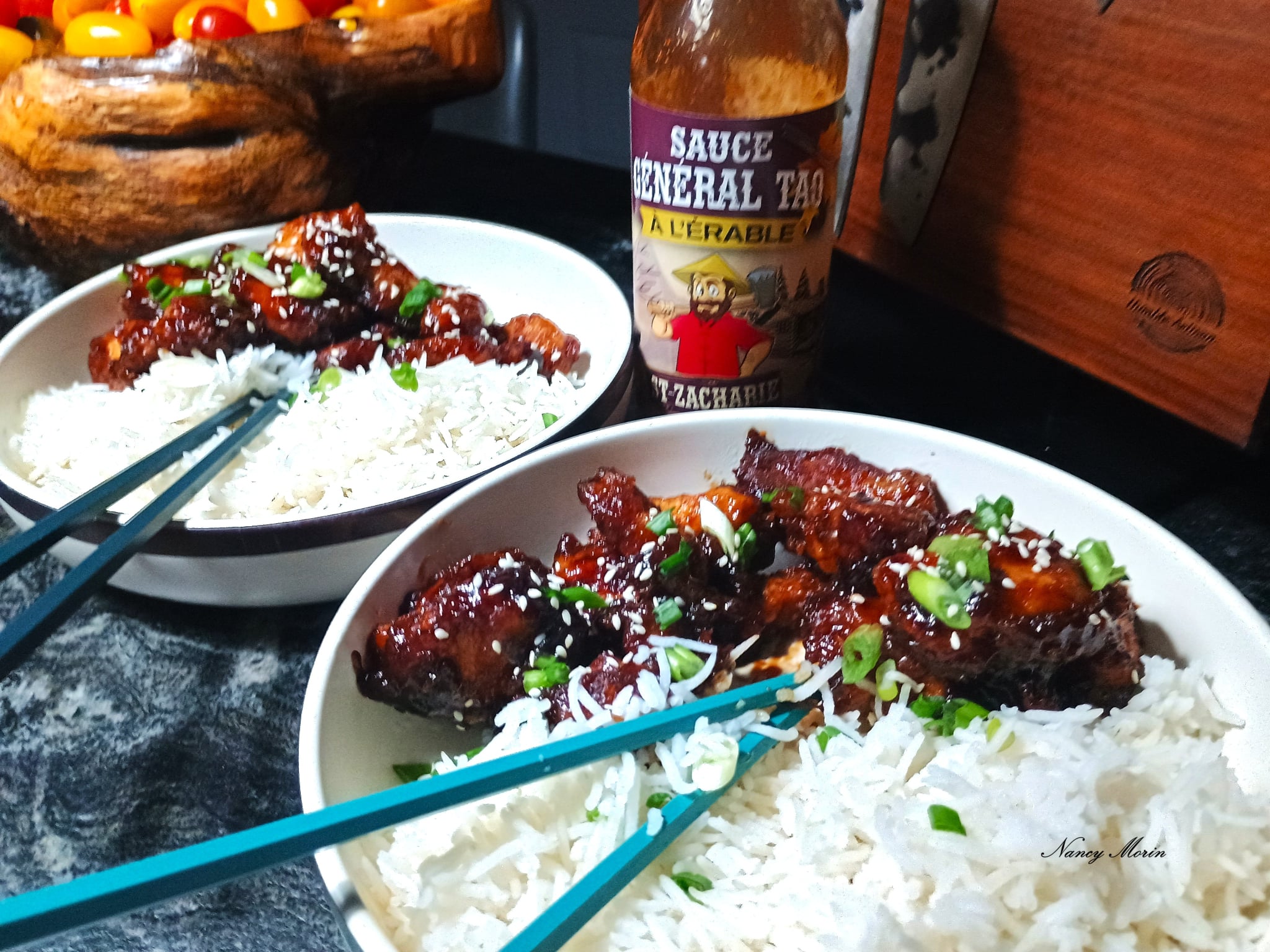 Ils sont ensuite nappés d’une sauce Général Tao à l’érable de la Ferme JN Morin, douce et caramélisée, qui enveloppe chaque morceau d’une gourmandise irrésistible. Servi sur un lit de riz basmati parfumé, le plat est sublimé par la fraîcheur des oignons verts et le croquant des graines de sésame.